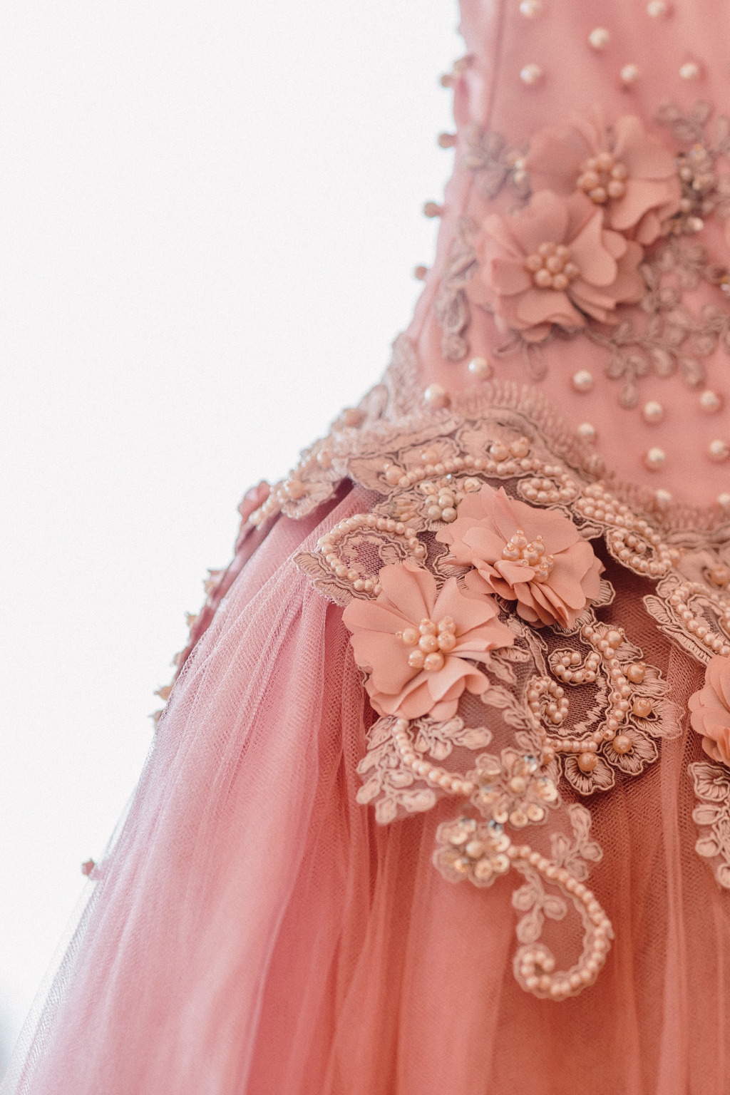Corsetería, faldones con volumen, pedrería y paleta de color personalizada.